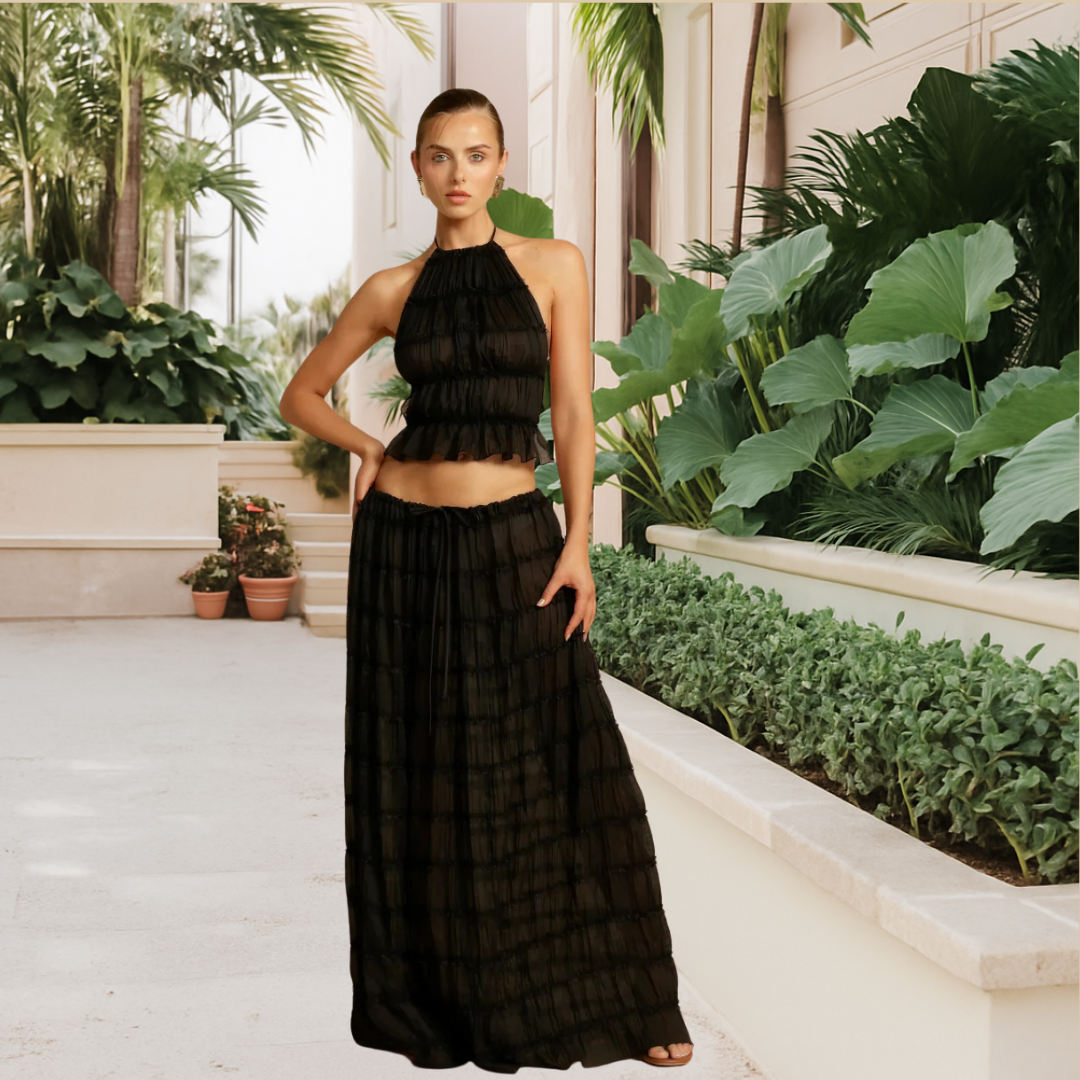 Un top femenino acompañado de un Falda suave y vaporosa.